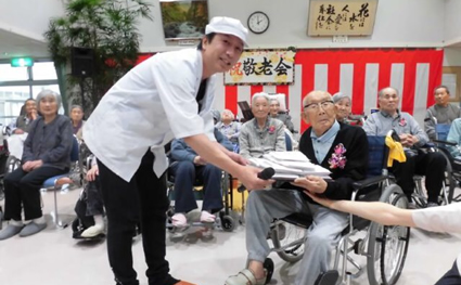 いなみや菓子店では毎年敬老の日に老人ホームへのお菓子の寄付運動を行っています。
