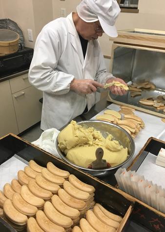 大阪駅に着くと早速バナナを食べ、弘前市に帰った店主はバナナの芳香と味を持つ菓子製作に励み、観桜会の始まりより2年早い16年(大正5年)。研究の末に製法を編み出したと言われている。
